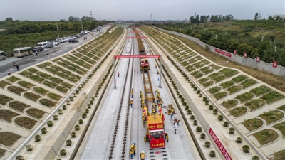 这是9月5日拍摄的汉十高铁铺轨施工现场(无人机拍摄)。