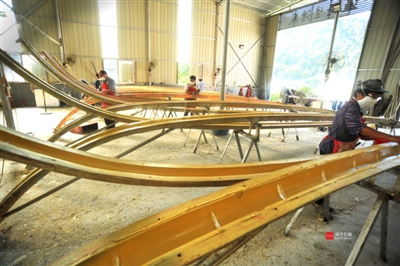 9月3日, 崇阳县白霓镇石山村天之诚玻璃钢制品有限公司生产车间内,工人们正在赶制玻璃钢渔船。