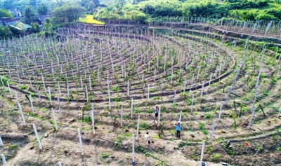 3日,通城县塘湖镇大埚村高山富硒有机水果基地,工人们正在给八月瓜搭架。