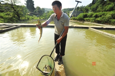 从事20多年水产养殖的陈金明观察村里山泉水三年,发现非常适合养冷水鱼,去年建起22个100平方米的鱼池,投放10万尾中华鲟,当年获利近20万元。他将采取“公司+农户”模式,与当地农户签订养鱼协议,带动村民养殖致富。