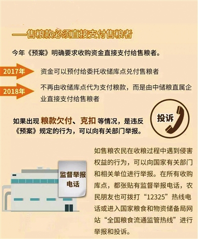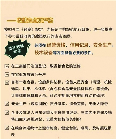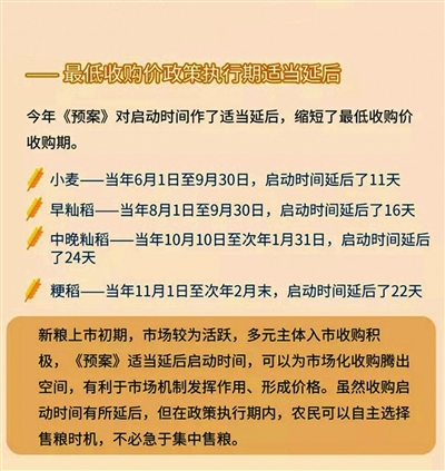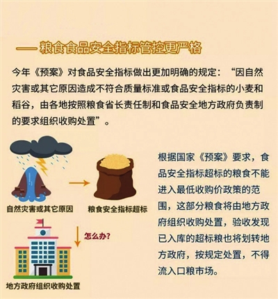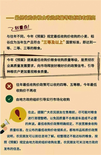 为帮助广大农民和社会各界了解国家最新粮食最低收购价政策,更好地维护粮食生产者、经营者、消费者的利益,我们特结合国家发改委等6部门今年印发的《小麦和稻谷最低收购价执行预案》,对《预案》条款在启动时间、启动条件、收购标准和粮食食品安全指标管控等方面出现的政策变化进行重点解读,以保障农民朋友能够按时卖出粮、卖好粮,卖好明白粮,卖好放心粮。