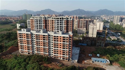 只见两栋住宅楼立面装饰已经建成,大楼内部没有装修,没有安装电梯,小区道路、绿化等工程还未建设。