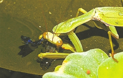研究人员近日首次拍摄到螳螂捕食鱼类的画面。据国外媒体报道,在印度一个屋顶花园的小鱼池中,一只螳螂站在一片漂浮的叶片边上,伸出强有力的前肢将水中的小鱼牢牢抓住。这只螳螂的体长超过5厘米。