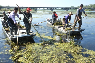 11日,崇阳县隽水河河面,工人在打捞疯长的水葫芦。