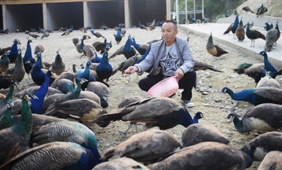 沿着大道,走入青山环绕的“百鸟朝凤”百鸟园区,上百羽蓝孔雀引人驻足,这里也是万羽孔雀养殖园。养殖园采取“公司+基地+贫困户寄养”的模式,由公司投资建设养殖基地,负责种雀引进、技术服务和订单回收,贫困户喂养管理。目前已挂靠23户贫困户养殖,每年固定分红2000元。