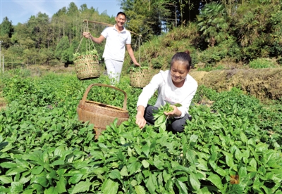 12日,崇阳县金塘镇桥上村雪礼苦菜种植基地,付雪礼夫妻在地头采收苦菜。
