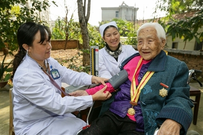 17日,希望桥社区卫生服务中心的医护人员为104岁抗日老革命牛义卓做体检。在全国第九个敬老月来临之际,咸安区组织开展重阳节走访慰问送温暖活动,为16名百岁老人免费上门做体检,并送上1000元慰问。