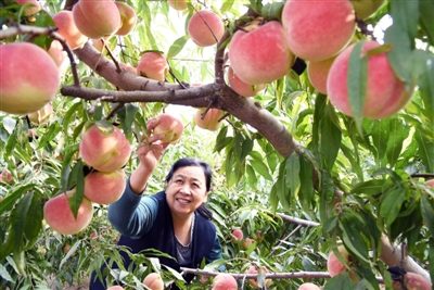 10月22日,山东省阳谷县侨润街道前杨村农民在果园采摘桃子。
