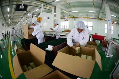 24日,湖北(通城)艾舒宝生活用品有限公司员工正在包装产品。