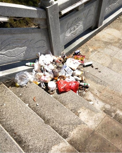 在观音广场前面的台阶上,扔有各种各样的垃圾:烟头、纸巾、塑料袋、吃剩的甘蔗渣滓、各种零食的外包装……而在5米之外,就有一个垃圾桶。