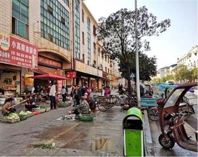 上午11时,交通路菜市场门口,路边摆摊的菜贩将烂菜叶、鱼内脏等垃圾随意丢在路边,臭味弥漫。
