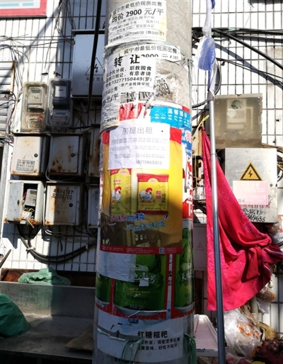 11月1日上午,咸安渔水路,记者看到,电线杆、水管、墙壁上,到处都贴有转让店铺、卖房子、维修办证等各种广告。在市博物馆旁方刘巷的电线杆上,也贴着几张房屋出租的广告。