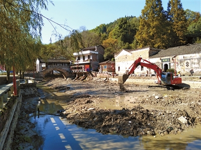 为打造和提升刘家桥传统村落环境,近日,桂花镇对穿村而过的白泉河进行清淤,铺设生活污水管,拆除乱搭乱建及户外广告。 通讯员 吴剑 摄
