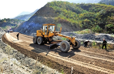 1日,通山富水库区南岸公路大畈镇板茶大桥至慈口乡茶园村路段,平路机、压路机正在铺设公路水稳层。