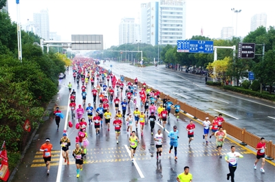 上午8时许,随着“啪”的一声发令枪响,一万多名选手从人民广场快乐出发。