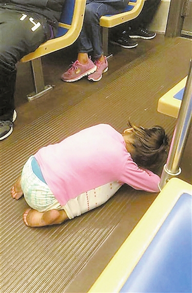 视频中,一个衣着单薄的小女孩脸朝下跪趴在地板上,光着脚丫,看起来脏兮兮的。乘客与她的父母交谈,他们表示,由于最近驱逐事件越来越多,他们离开了原来的住所。