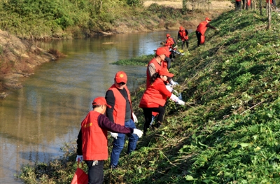 9日,咸宁高新区横沟桥镇横沟河,护河志愿者正在两岸清理垃圾。