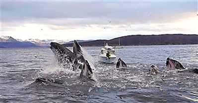 近日,在挪威北部的谢尔沃于市海域,一名游客用视频记录下了一群座头鲸协作捕鱼的壮观画面。 慢镜头显示,一大群鱼游到了水面,片刻之后,一群座头鲸从水中冒了出来,开始聚餐。它们使用一种“气泡网”的方法,吐出气泡,迫使鱼群到达水面。接下来,它们只需要张开大嘴饱餐一顿就是了。可以看到大量的鱼进入它们的嘴里,画面令人震撼。