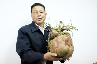 19日,全市拥军模范张日平在自家地里挖出一个重达7公斤的大红薯。