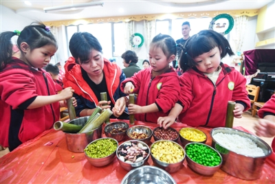 在小雪节气即将到来前,浙江省长兴县李家巷镇中心幼儿园的孩子们在老师的带领下,用大米、糯米、玉米、南瓜、赤豆、咸鸭蛋等农产品亲手制作竹筒饭、八宝糕、糯米团、糖葫芦等,让孩子们在制作传统美食的过程中了解节气文化,在欢乐的气氛中迎接小雪节气的到来。
