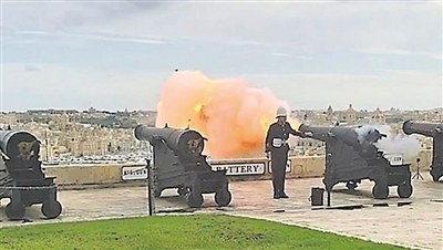 近日,马耳他共和国举行了传统的鸣礼炮仪式。凑巧的是,一只鸽子从炮口前面飞过时正好被一发炮弹击中。旁边的游客拍下了这一幕。录像显示,当时一名士兵背对炮口而立,然后快速拉了一下连接礼炮的绳子,炮弹随即发射了出去,巧合的是,一只鸽子刚好飞过炮口。在一团烟雾中,鸽子不见了踪影。