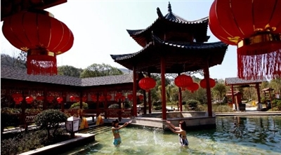 龙佑赤壁温泉度假区内40多处多功能各异,极具特色的温泉池依山傍水散布在山间林下。自然园林式的景观温泉区,温泉从石洞中涌出,蜿蜒流淌在湖畔山间,置身于温泉池中,感受温泉带来气泡汩汩从身下冒出,享受瀑布、青山、蓝天,便有了“人间天堂”的感觉。