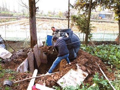 日前,新街镇余码头村村民正在安装全新的三格化粪池。据介绍,使用这套新设备,不需要复杂的拼接程序。设备直接抬放入土坑,再搭建好进水口、出水口水管,整套安装程序完毕。去年以来,经过各村的共同努力,新街镇彻底改变了厕所脏乱差的状况。 通讯员 杨远思 摄
