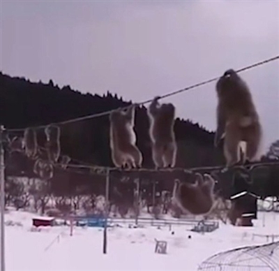近日,一段拍自日本青森县陆奥市的成群猕猴为了取暖集体走电线的视频走红网络,猕猴们个个后肢踩一条电线,前肢攀着上面一条电线,一步步地扭着身体移动着,画面十分滑稽。