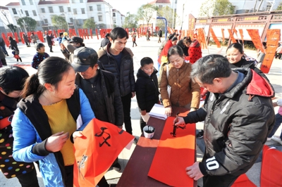 据了解,当天,市、区老年大学和诗书画协会一行20余人来到付桥村,开展送春联进万家活动。书法家们尽情挥毫泼墨,把一副副满载新春祝福的春联送到当地群众的手上,为即将到来的春节增添了浓厚的节日气息。