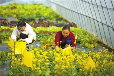 21日,咸宁市咸安区汀泗桥镇古塘村联发蔬菜种植专业合作社的蔬菜大棚里,工人们正在护理盆栽绿色蔬菜。
