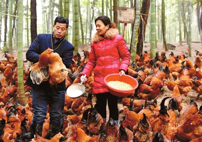 “喔喔喔”冬日晨雾中,公鸡在坪头岭竹林中扑打着翅膀。1月16日,通城县塘湖镇贫困户张亮甫吹着口哨将玉米和着细糠抛向鸡群,一千多只鸡吃得正欢。