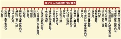 说明:咸宁市人民政府设置工作部门33个。民族宗教事务委员会与市委统一战线工作部合署办公,列入市政府工作部门序列,不计入市政府机构个数。发展和改革委员会挂粮食局牌子;住房和城乡建设局挂人民防空办公室牌子;水利和湖泊局挂河湖长制办公室牌子;文化和旅游局挂广播电视局、体育局牌子;市场监督管理局挂知识产权局牌子;政务服务和大数据管理局挂公共资源交易监督管理局牌子。档案局在市委办公室加挂牌子,由市委办公室承担相关职责;公务员局在市委组织部加挂牌子,由市委组织部承担相关职责;新闻办公室、新闻出版局(版权局)在市委宣传部加挂牌子,由市委宣传部承担相关职责;侨务办公室在市委统一战线工作部加挂牌子,由市委统一战线工作部承担相关职责;港澳事务办公室在市委外事工作委员会办公室加挂牌子,由市委外事工作委员会办公室承担相关职责。台湾事务办公室与市委台湾工作办公室一个机构两块牌子,在市委统一战线工作部加挂牌子;互联网信息办公室与市委网络安全和信息化委员会办公室一个机构两块牌子,设在市委宣传部;外事办公室与市委外事工作委员会办公室、国家保密局与市委机要和保密局,一个机构两块牌子,列入市委工作机关序列;国家密码管理局与市委密码工作领导小组办公室一个机构两块牌子,在市委机要和保密局加挂牌子。