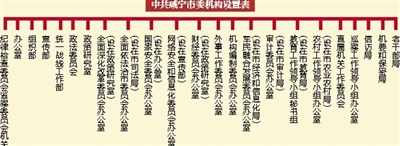 说明:中共咸宁市委设置纪检监察机关1个,计入机构限额的工作机关13个(设在相关部门的市委议事协调机构的办事机构不计入机构限额)。统一战线工作部与市民族宗教事务委员会合署办公。办公室挂市档案局牌子;组织部挂市公务员局、非公有制经济组织和社会组织工作委员会牌子;宣传部挂精神文明建设指导委员会办公室、市人民政府新闻办公室、市新闻出版局(市版权局)牌子;统一战线工作部挂台湾工作办公室(市人民政府台湾事务办公室)、市人民政府侨务办公室牌子;外事工作委员会办公室挂市人民政府港澳事务办公室牌子;机要和保密局挂密码工作领导小组办公室(市国家密码管理局)、专用通信局牌子。网络安全和信息化委员会办公室与市互联网信息办公室,外事工作委员会办公室与市人民政府外事办公室,机要和保密局与市国家保密局,一个机构两块牌子。