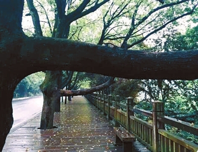 月亮湾栈道边的老树经历了无数岁月,被连绵的雨水滋养出了许多青苔。