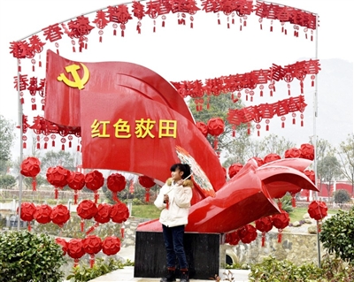 驱车来到茶场坳,只见公路两旁太阳能灯杆上大红灯笼高高挂起,一直延伸到山边,两旁居民楼房前桂花吐绿,鲜花飘香。绿色丛林中的纪念馆和红色广场在春雨中静穆,来往的游客脚步匆匆,村民脸上扬着自信。