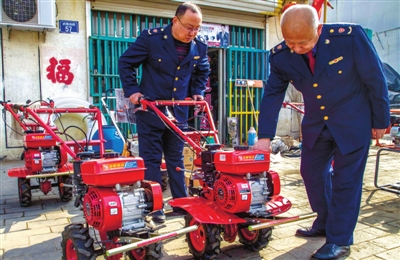 2月27日,河北永清县市场监督管理局工作人员在检查店铺销售的微耕机。近日,河北省永清县开展农资打假“红盾行动”,为春耕备耕保驾护航。 据新华社