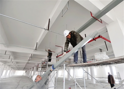 3月1日,赤壁市中伙光谷产业园高瞻科技有限公司,工人们正在进行内部装修。