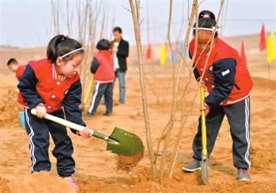 3月11日,小学生在邢台市桥西区伍仲村植树。