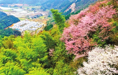 3月17日,崇阳县天城镇茅井新村掩映在一片樱花丛中。