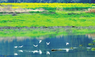 从浪口大桥顺河堤而下,沿途宁静的村庄,自然形成的小湿地,水中的野鸭,岸边刚抽芽的树,翡翠黄的油菜花,醉卧花丛的牛群,放学归来的孩童,悠闲垂钓的老农,构成这里独特的风景……