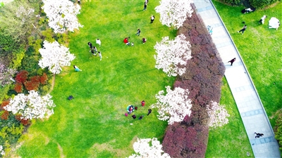 人们三五相邀,观花赏景,游园踏青。林间小路,池塘水边,踏青的人儿尽情地撷取初春的芳香。