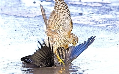 一只雀鹰欲捕食一只寒鸦,但它并不是像通常那样将寒鸦啄死,而是把它摁到水里,试图将其溺死,所用手段实在太出乎人意料。