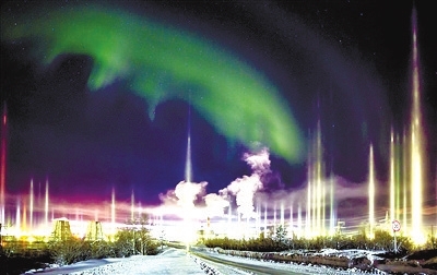 俄罗斯摩尔曼斯克州阿帕季特附近,两名姑娘泡温泉邂逅罕见的极光光柱美景。她们用相机记录了这一不可思议的景象。照片中,神奇又美丽的极光光柱与城市的灯火交相辉映,远处的发电厂在光柱之中若隐若现,整个场景仿佛科幻大片中的世界。
