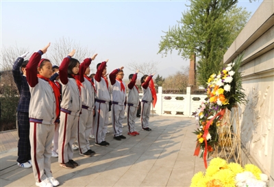 4月3日,石家庄市井陉矿区第一小学学生在革命烈士纪念碑前敬礼。
