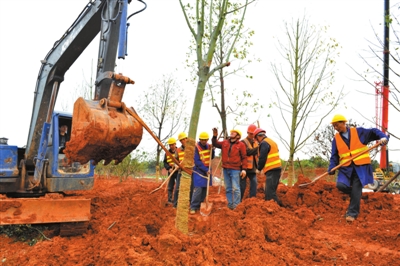 4日,泉都大道上工人们使用吊机、挖机进行大规模植树。