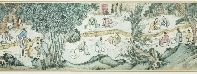 上巳节在魏晋南北朝时期固定在了三月三日,《晋书·礼志》记载:“自魏以后,但用三日,不以上巳也。”节日的内容也更加丰富,其中最为盛行的当属“曲水流觞”。所谓“曲水流觞”是指一种文化活动,人们坐在弯曲的小溪旁边,把盛满酒的耳杯(觞)放在水上,酒杯沿着曲水顺流而下,停在谁的面前,谁就要赋诗一首,诗不成则要罚酒。“曲水流觞”在魏晋时期非常流行,《初学记》援引《荆楚岁时记》说:“三月三日,士人并出水渚,为流杯曲水之饮。”著名的《兰亭集序》就是王羲之为一次曲水流觞活动写的序言。