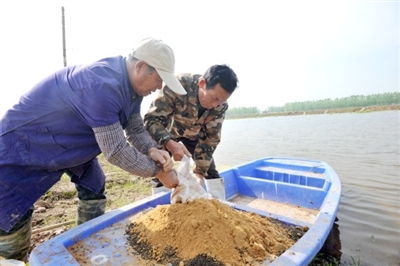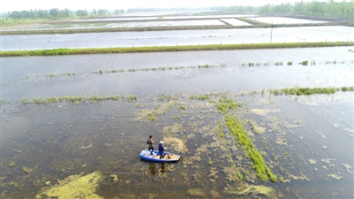 16日,嘉鱼簰洲湾镇金家洲村稻虾基地,工人们正在虾田里投饵料。