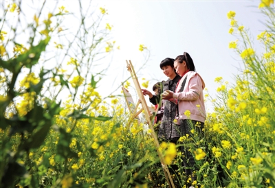 4月16日,河北省内丘县杨庄小学的师生在油菜花田中写生。