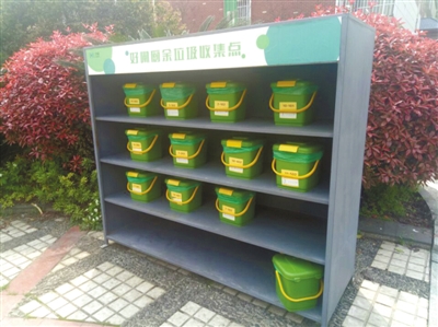 11日,记者来到双鹤路昱园小区,只见小区干净整洁,花坛地带设置了“厨余垃圾收集点”,不少绿色小桶放在架子上,桶上标有数字,对应楼栋、房号。不远处有两个绿色的大厨余垃圾桶。