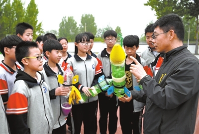 河北省廊坊市第十三中学教师(右一)给学生讲解水火箭发射原理。